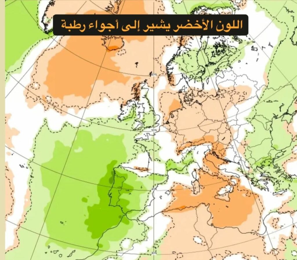 وفقاً لبيانات الساتل وتحليل الخرائط الجوية (حيث يشير اللون الأخضر في الصورة المرفقة إلى أجواء رطبة واحتمال تساقطات)، من المتوقع: