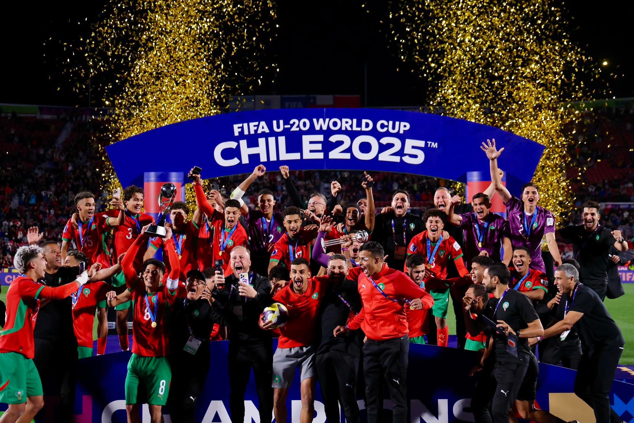 كتب (كاف)، على موقعه الإلكتروني الرسمي، أن منتخب المغرب انضم إلى نخبة المتوجين بلقب كأس العالم تحت 20 سنة، مضيفا أن “أشبال الأطلس” تمكنوا من تحقيق إنجاز كبير بفوزهم في نهائي كأس العالم تحت 20 سنة 2025، أمام منتخب الأرجنتين، بنتيجة 2-0، خلال سهرة الأحد 19 أكتوبر، في ملعب، خوليو مارتينيث برادانوس، بمدينة سانتياغو الشيلية، ليتوجوا بأول لقب عالمي في تاريخهم.